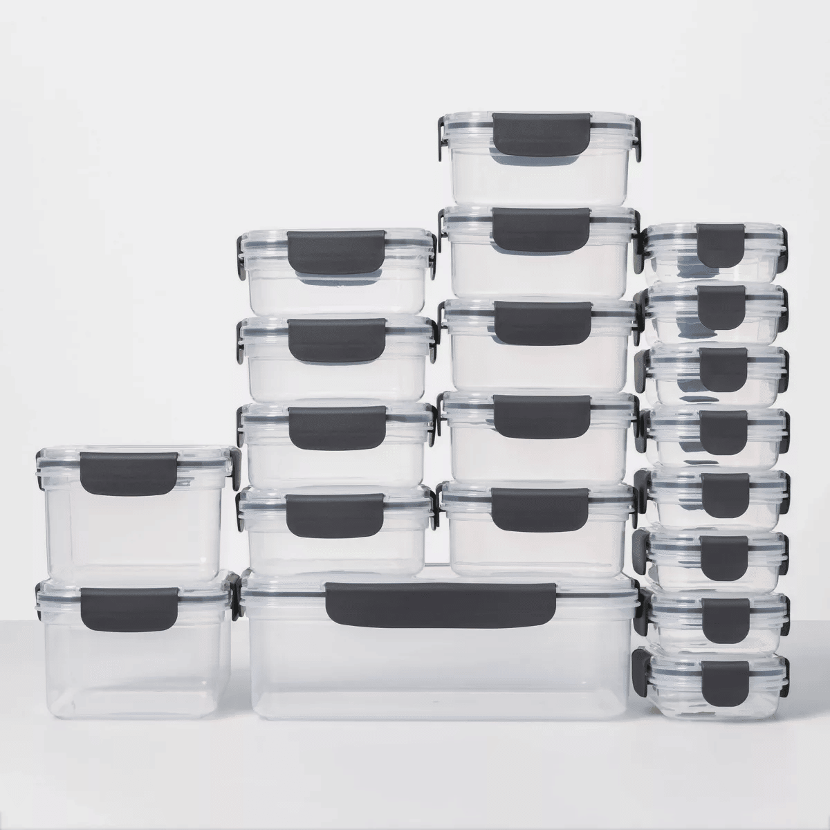 Conveniently store food and bring organization to your kitchen or pantry with the 40-Piece Plastic Food Storage Set . Featuring a clear that lets you have a look at the contents from the outside, these plastic food containers feature four-latch lids that not only help food maintain its original flavor and freshness, but also prevent spills and messes. With a range of sizes, these food storage containers are great for storing anything from cookies, snacks, cut fruits and salads to leftovers or prepped lunches, while the compact size and rectangular silhouette of some of the containers make it easy to fit in your lunch bag or tote for light nibbling in the office or between lessons in school.