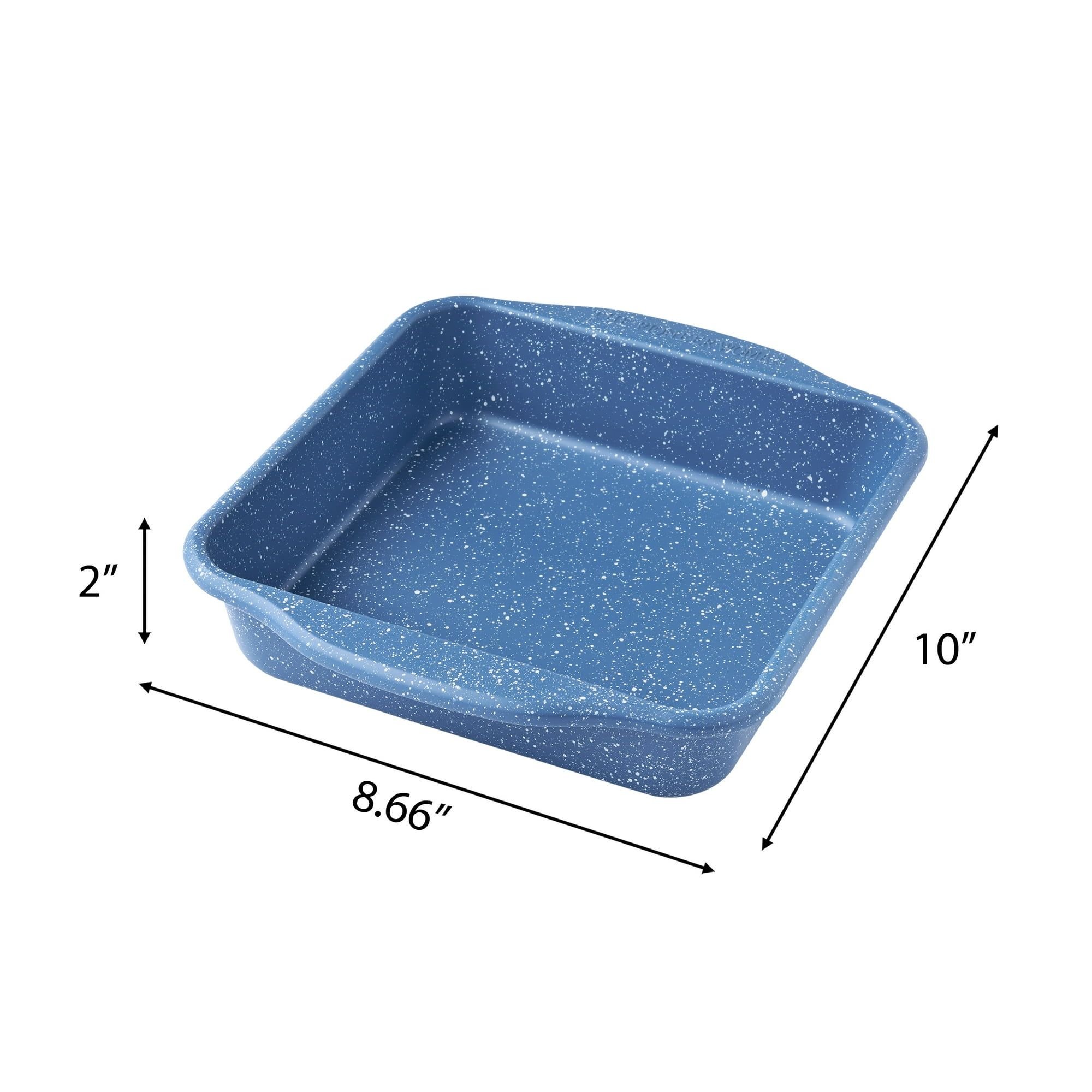 Durable Construction: Crafted from heavy-gauge aluminized steel, this 8-inch square cake pan ensures excellent heat distribution and lasting durability for consistent baking results.Nonstick Performance: Features a premium nonstick coating for effortless food release and simplified cleanup, making it ideal for various baked goods.Generous Dimensions: The pan measures 8" x 8" x 2" externally, with interior dimensions of 7.95" x 7.95" x 1.98", suitable for cakes, brownies, and casseroles.Stylish Appearance: Boasts a distinctive blue speckle finish, adding a vibrant pop of color to any bakeware collection.High Heat Tolerance: Safely oven-compatible up to 450°F, accommodating a wide range of baking temperatures.Care Recommendations: Hand washing in hot soapy water is recommended to maintain the nonstick performance and prevent damage from metal utensils.
