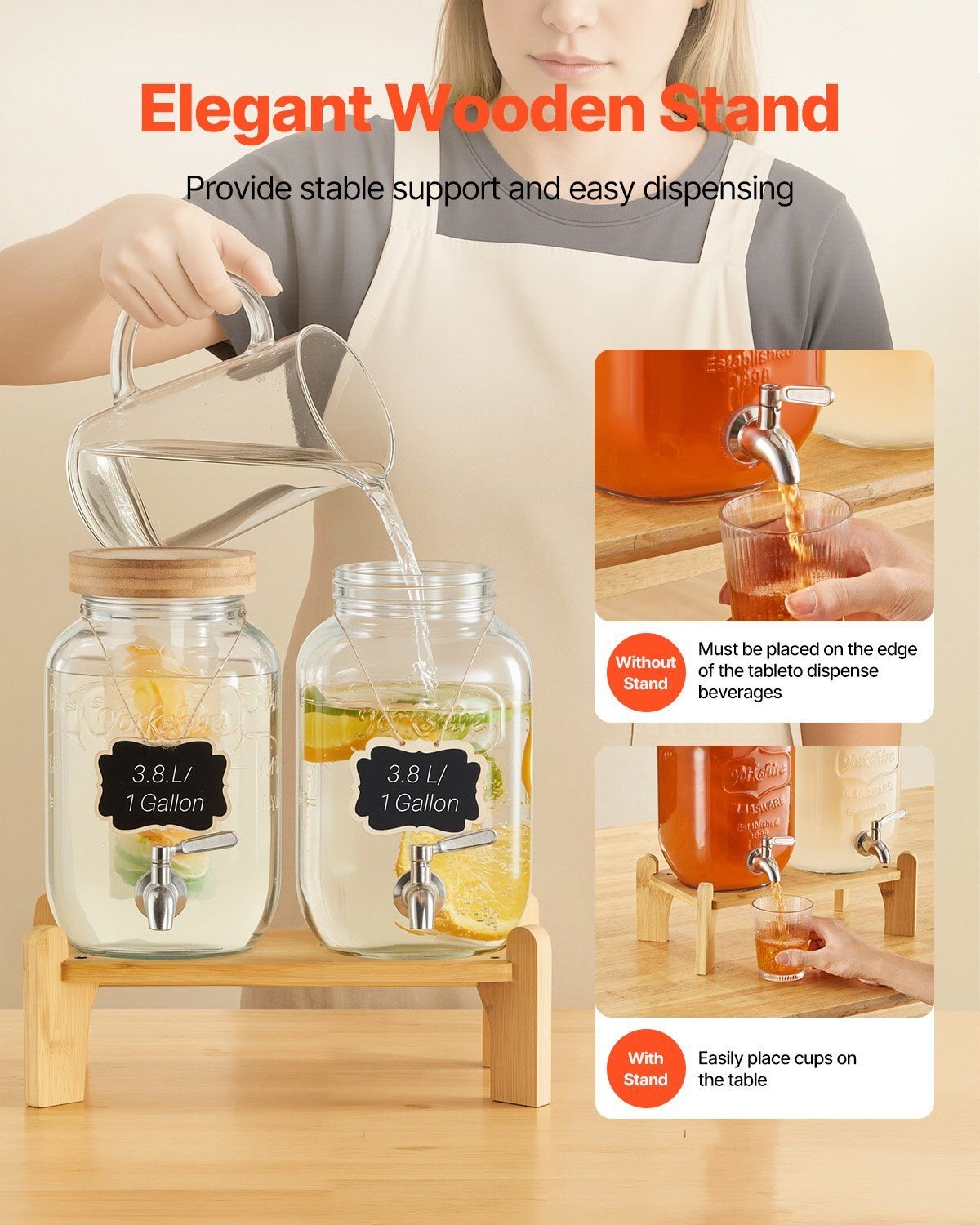 4.Easy to Use: The wide-mouth design makes the juice dispenser easy to refill, the wood stand provides stable support and easy dispensing, the lid prevents dust or dirt from entering, ensuring your juices stay clean and delicious