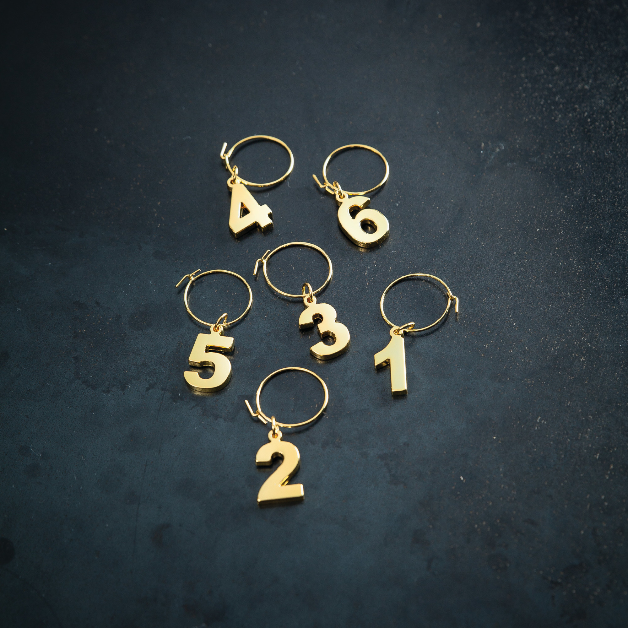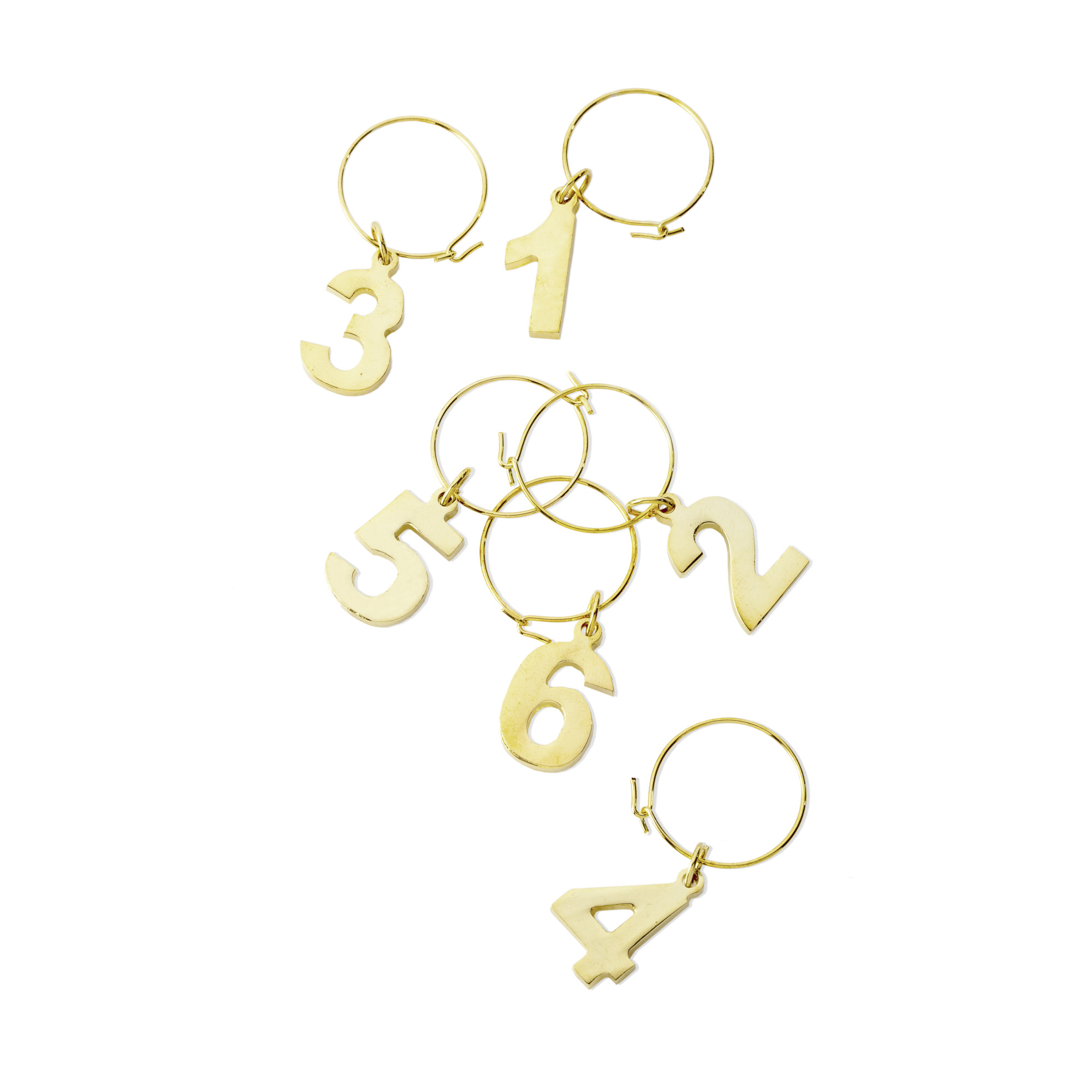 Keep tabs on glassware with a set of six bold gold wine charms. The polished numbered markers fit all standard stemware to help guests keep chiantis straight from cabernets.