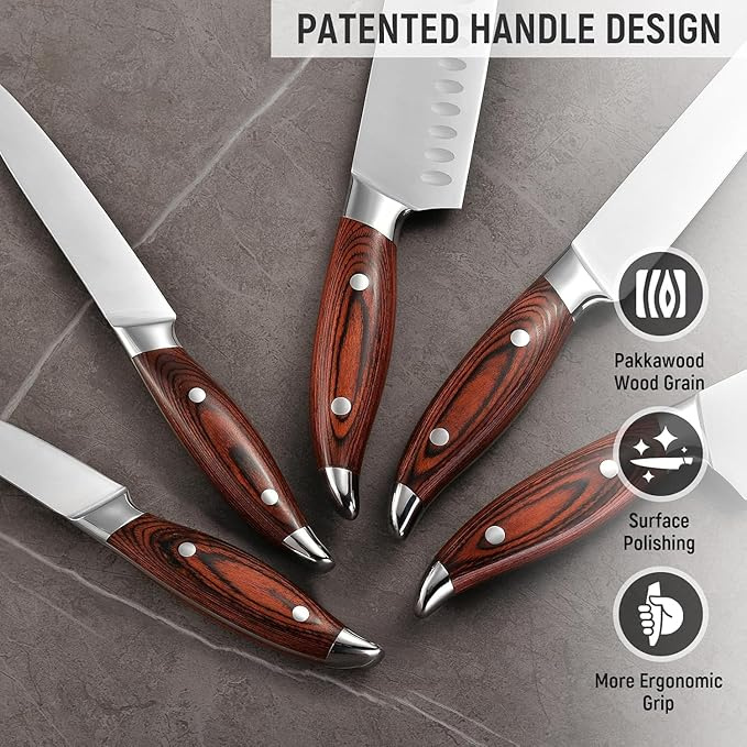 This 5-piece kitchen knife set is crafted from high carbon stainless steel for excellent durability and edge retention. Each knife features an ergonomic handle that provides comfort and control while chopping, slicing, and dicing. Perfect for everyday kitchen use, this set combines functionality and style, making it ideal for home cooks or as a gift for cooking enthusiasts.