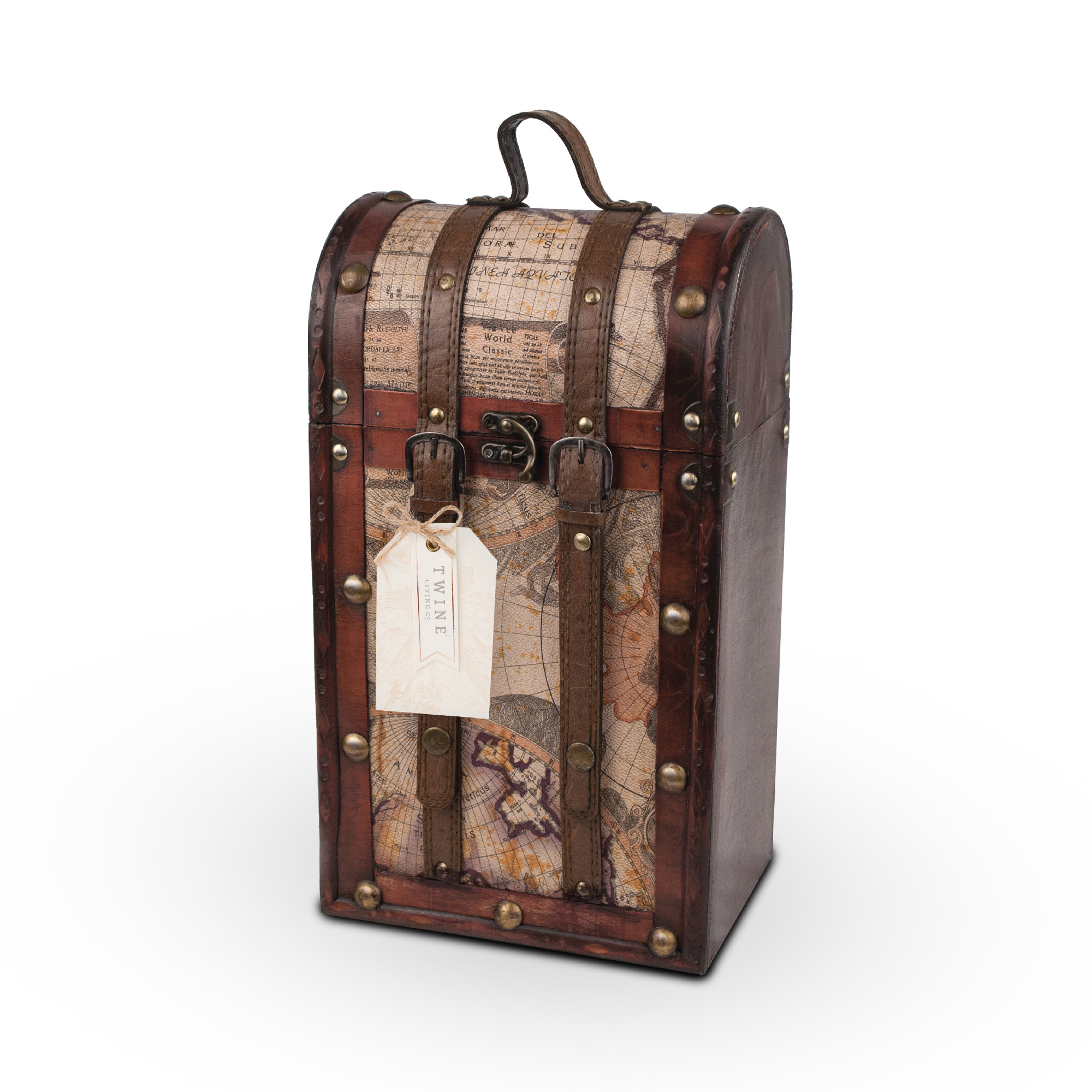 Our 2-bottle Old World wine gift box has old world charm. It comes with an aged wood finish, brass accents, luggage straps and an antique map design. An excellent accessory for any history or travel aficionado and perfect as a special gift box for a good wine or a means of storing your own bottle out of the way of dust and sunlight. Wood and faux leather construction with brass buckle closure and wood bottle insert. Accommodates 2 standard wine bottles. 14.5" H x 8.5" W x 6" D.