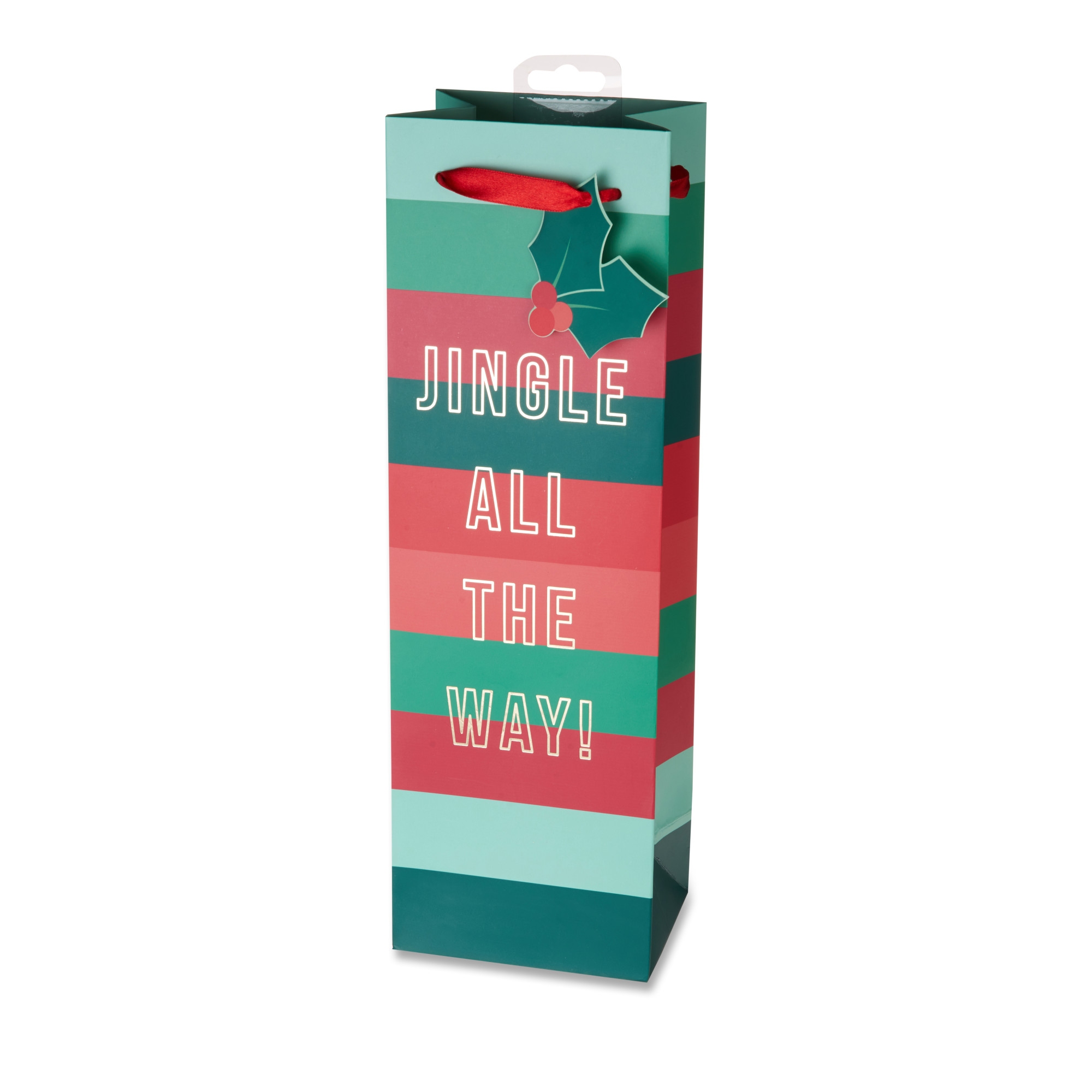 Mistletoe, presents, and wine: the holiday trifecta! Ring in the season with this cheerfully striped single-bottle bag. Ribbon handles, foil accents, and matching gift tag included.