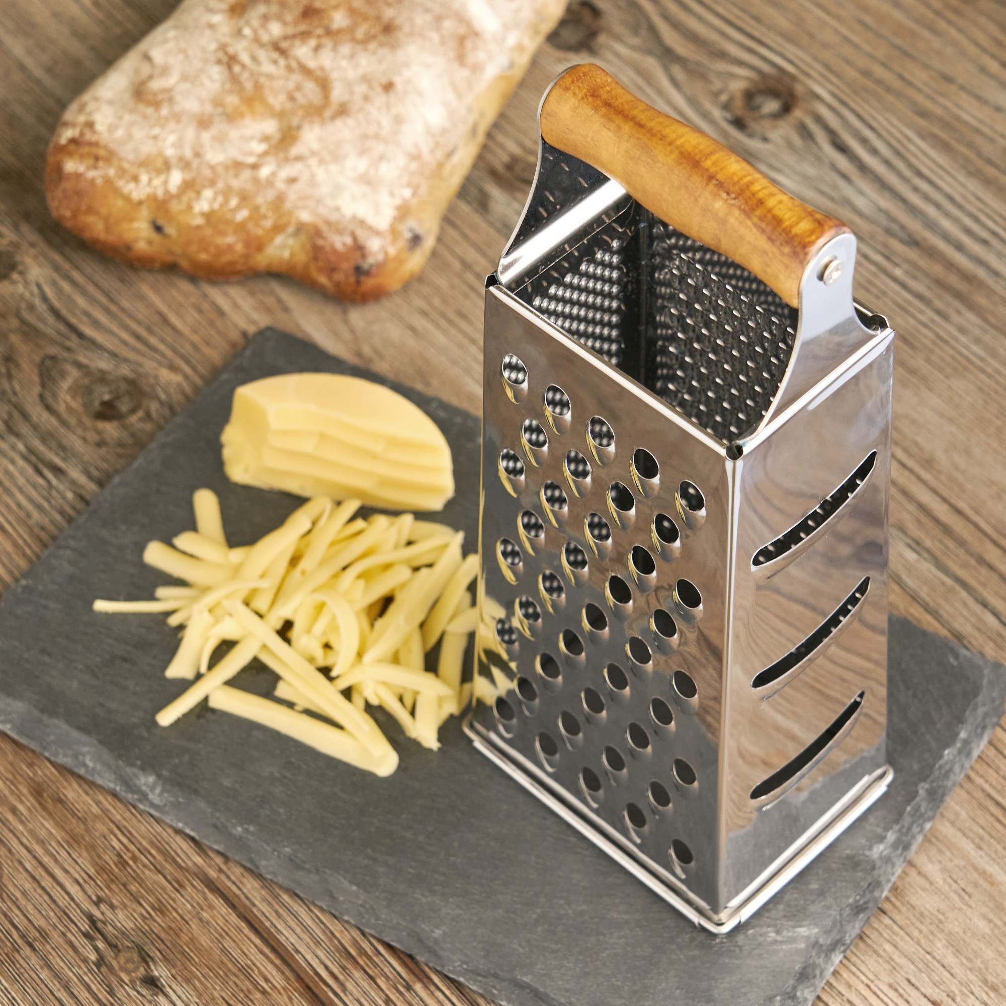 With four grating patterns to choose from, this stainless steel grater guarantees perfect snacks and appetizers. Warm, natural acacia wood makes it handsome enough to put on display. Stainless steel box grater with acacia wood handle and reinforced base. Hand wash recommended.