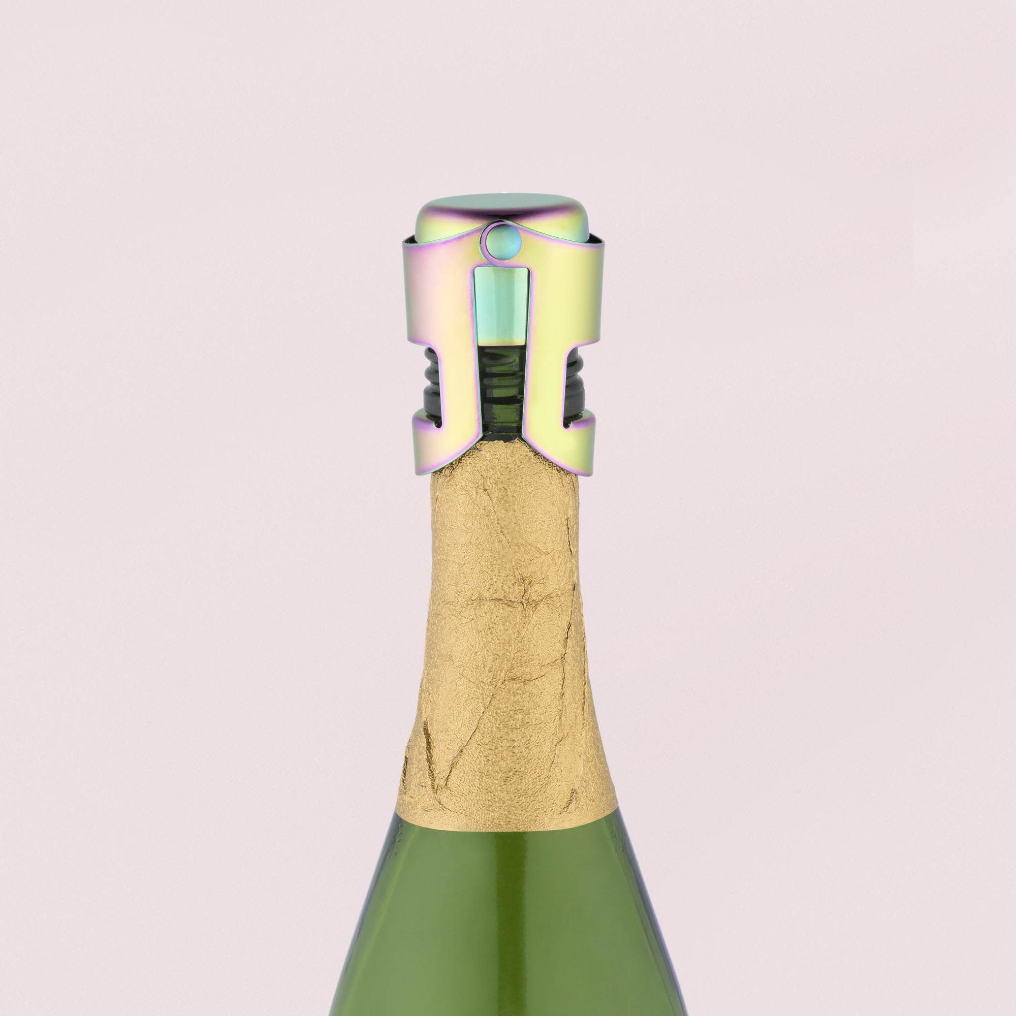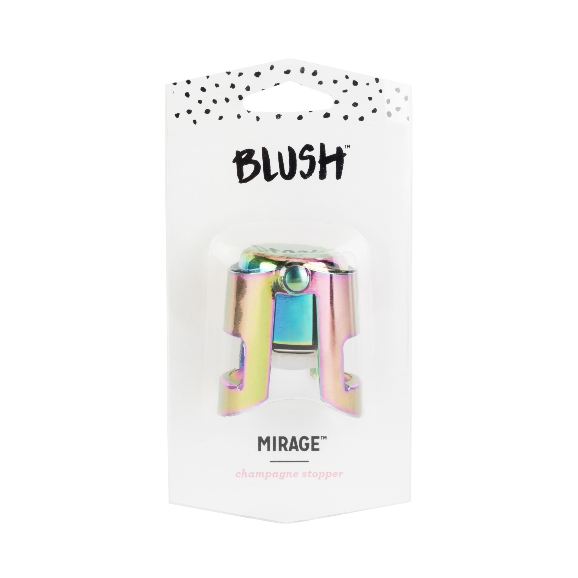 Champagne is always in fashion! And the perfect accessory for a little bubbly is a Mirage champagne stopper by Blush. Its trendy oil slick finish adds a pop of shimmer and glam to your home bar. Fits standard bottles. Mirage rainbow plated stainless steel. Keeps your champagne fresh and great for mimosas!