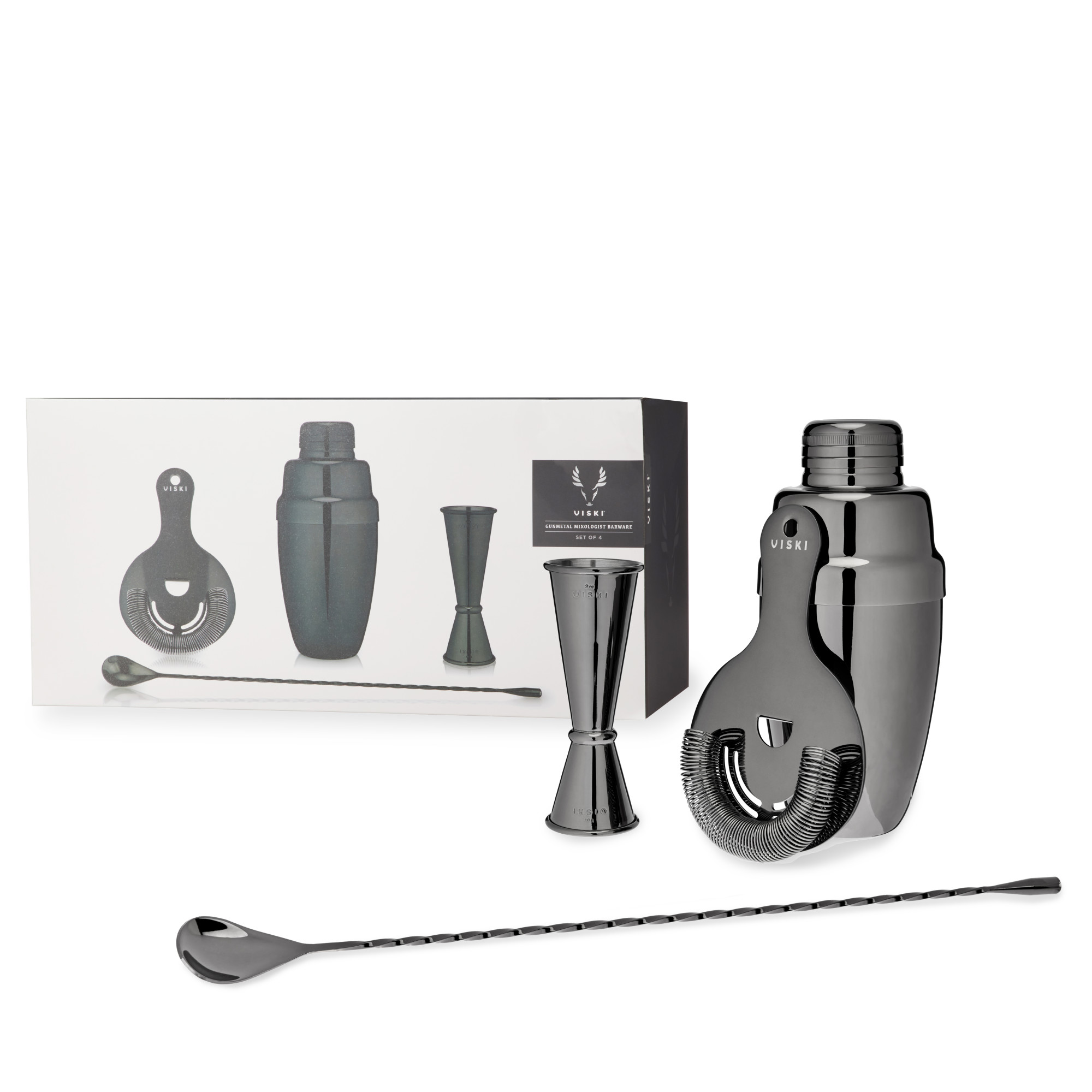 Shake up your bar collection with these sleek gunmetal contenders. Our 4-piece commercial-grade barware set is perfect for creating cocktails of quality, whether you're a pro or just starting out. Our kit includes: - Gunmetal Black double jigger for precision measuring. - Gunmetal Black weighted bar spoon that can crush ice and muddle fruit with ease. - Gunmetal Black Hawthorne strainer. Fits over the mouth of our lead-free crystal mixing glass to serve drinks without ice or muddled ingredients. - Gunmetal Black Heavyweight cocktail shaker. Using and Caring for Your Viski Barware Jigger: In the world of mixology, precision is king. Your professional-grade jigger has a capacity of 1 ounce on one side, 2 on the other, and shows markings at 0.5, 0.75, and 1.5 ounces. For the most reliable measurements, hold jigger between two fingers, steady, and fill to brim or measurement line. Tip contents quickly into mixing glass. Bar Spoon: Preserve your cocktails’ clarity by mixing instead of shaking. Pour ingredients into a chilled glass, insert bar spoon, add ice, and stir gently for up to 60 seconds. Hawthorne Strainer: Place over mouth of mixing glass and hold down with two fingers. Control how finely your cocktail is strained by sliding the strainer closer to or further from the lip of the glass. Care: Hand wash.