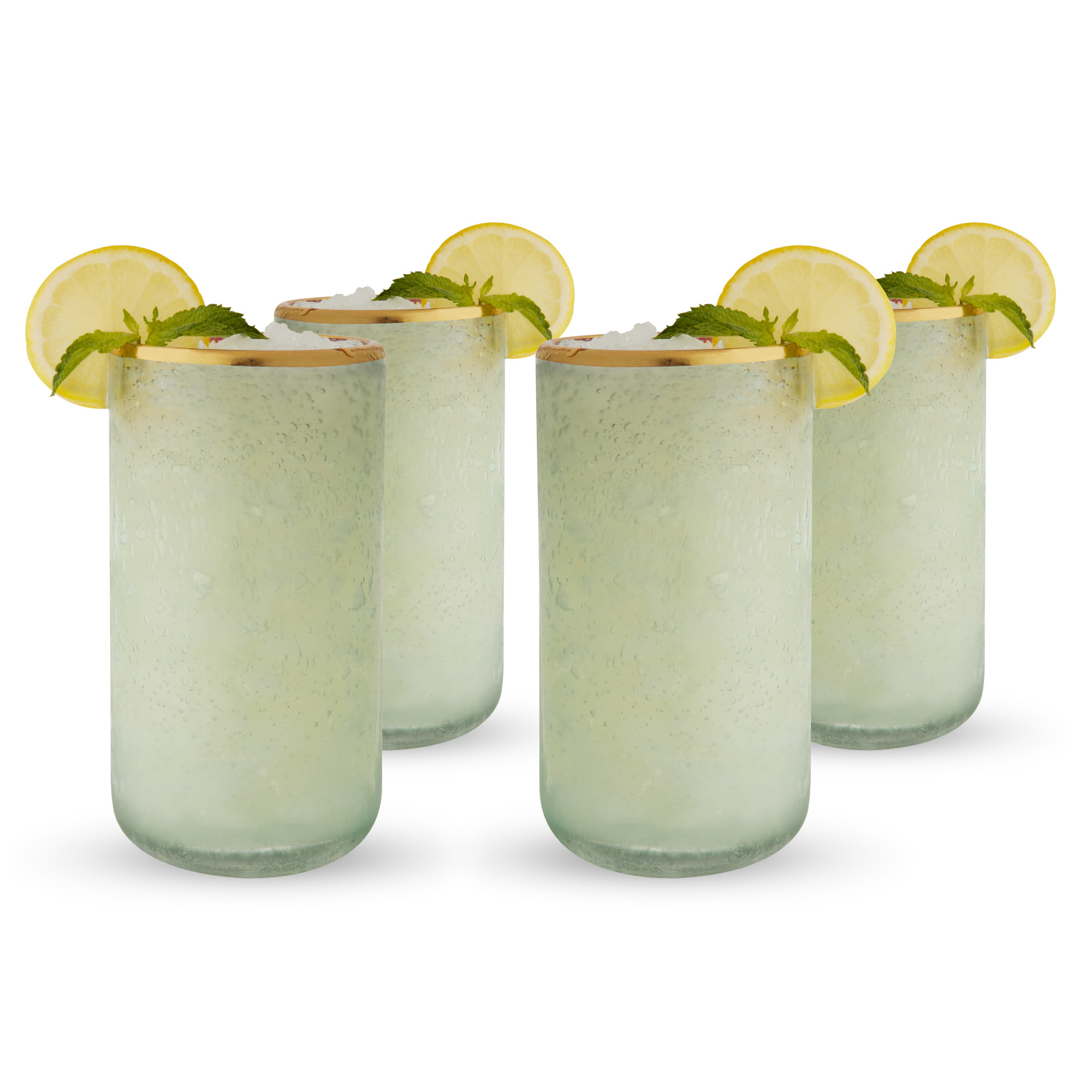 A series of delicate bubbles sit suspended in aqua-tinted glass while a laurel of gleaming gold plating adorns the rim, adding a vestige of intrigue to an already stunning set of glassware. Designed to contain 16 ounces comfortably, each tumbler is impeccably suited to accommodate any of your favorite mixed beverages. Set of 4 Holds 16 ounces each Bubbled glass detail Electroplated gold rim Makes a great gift Twine crafts glassware and home goods with an emphasis on classic style, natural materials, and a nostalgic sense of quality. From elegant glassware to charming bar tools, Twine ties everything together.