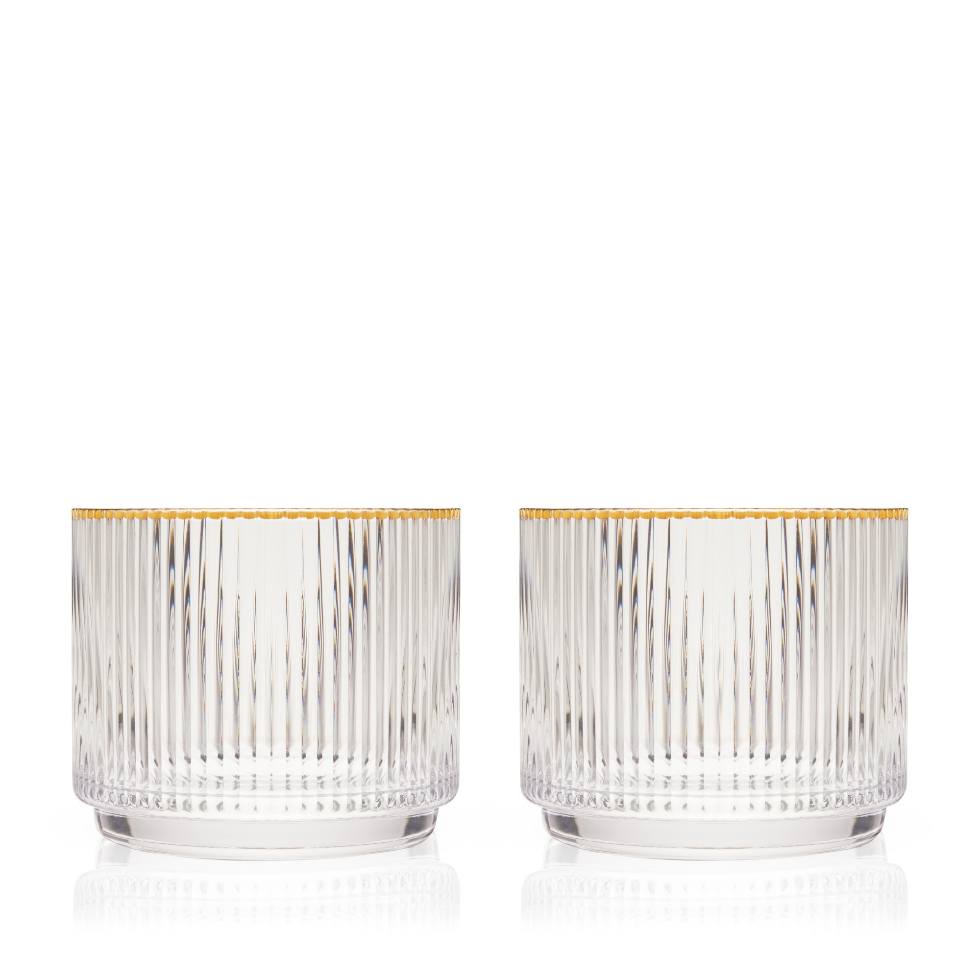 With stunning clarity and a rippled texture, this pair of stackable gold-rimmed tumblers are ideal for spirits on the rocks or lowball cocktails. The weighted base and rounded silhouette give each glass unique elegance that enhances your home bar or glassware collection. 12 oz. Hand wash recommended.