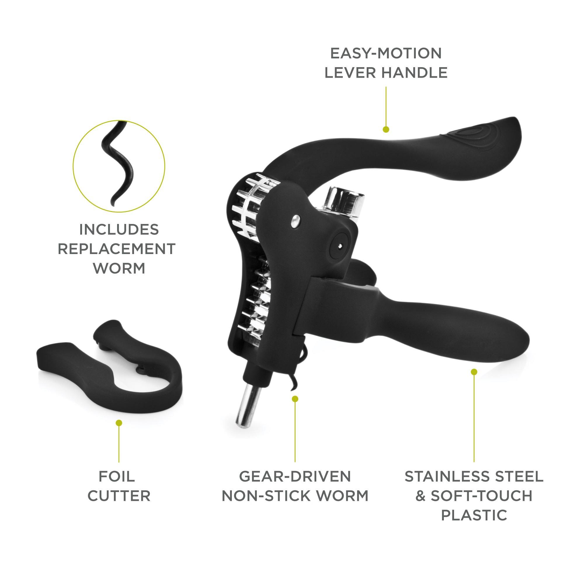 An ergonomic soft-touch body and easy-lever handle define the Virtuoso Lever Corkscrew. This classic wine opener stays propped off the counter on a kickstand so it’s always within reach. Just pump the lever down, pull up and your cork is out in one quick, smooth motion. Stainless steel & soft-touch plastic Easy-motion lever handle Includes foil cutter & replacement worm
